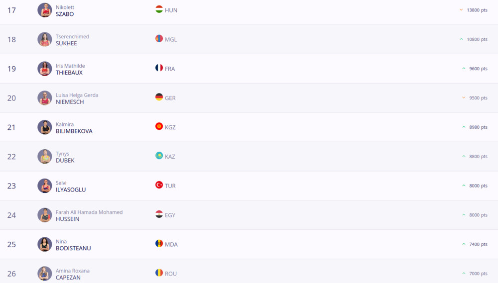 На данный момент в этой весовой категории от Кыргызстана есть Калмира Билимбек кызы, которая занимает 21 место.