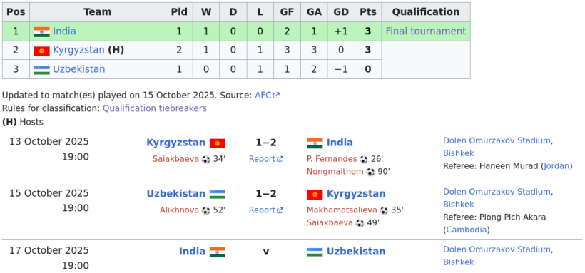 Женская сборная Кыргызстана по футболу U17 занимает 2 место по итогам двух туров отборочного раунда Кубка Азии-2026.