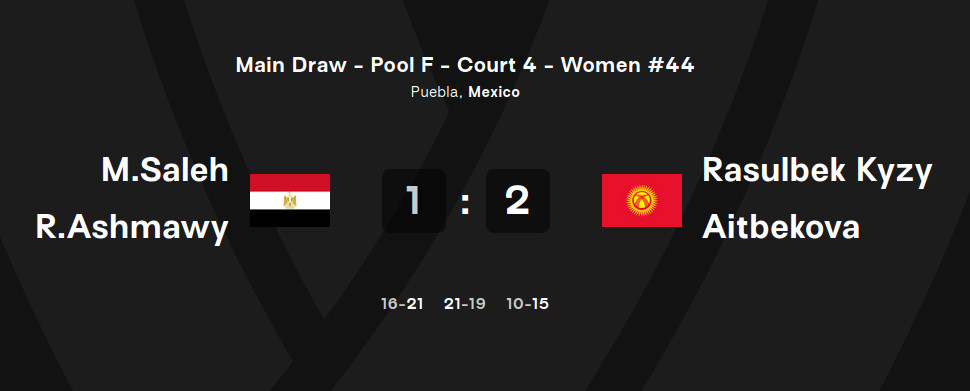 18 октября прошли игры заключительного тура группового этапа турнира. Сборная Кыргызстана в составе Розы Расулбек кызы и Айтурган Айтбековой играла против сверстниц из Египта и одержала победу со счетом 2:1 (21-16, 19-21, 15-10).