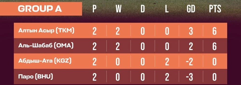 В группе А играет действующий чемпион Кыргызстана «Абдыш-Ата», которая по итогам двух туров потеряла шансы на выход в плей-офф. Кантовчане проиграли «Алтын Асыру» из Туркменистана (0:1) и «Аль-Шабабу» из Омана (1:2).