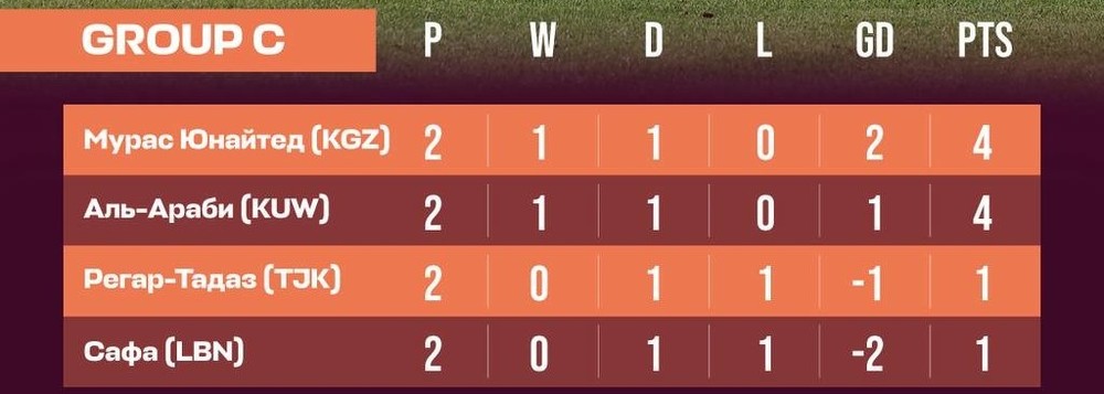 Обладатель Кубка Кыргызстана 2024 года «Мурас Юнайтед» из Жалал-Абада лидирует в группе С. Команда Сергея Пучкова в первом туре сыграла вничью с «Регар ТадАЗом» из Таджикистана (0:0), а во втором победил «Аль-Сафу» из Ливана (2:0).