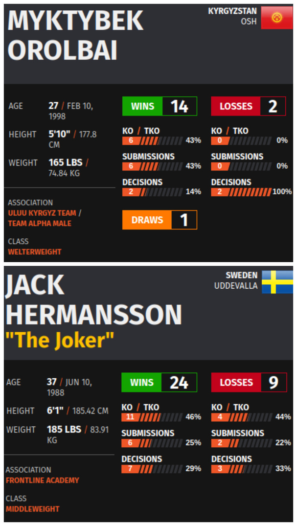 Джек Херманссон — самый опытный и габаритный соперник в карьере Мыктыбека. Его длина рук и рост затруднят кыргызстанцу работу в стойке. Хаотичная манера Херманссона сделает бой непредсказуемым, и чтобы победить, Оролбай уулу должен будет действовать осторожно и расчетливо, ловя шведа на ошибках и контратаках.