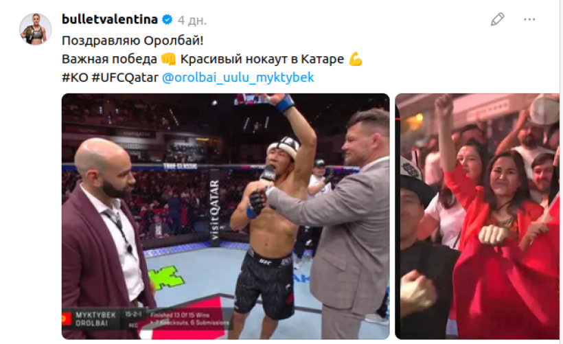 Чемпионка UFC в наилегчайшем дивизионе Валентина Шевченко на своей страничке в соцсетях поздравила кыргызстанца с победой.