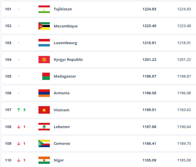 Кыргызстанцы в отчетный период матчей не проводили, но смогли сохранить за собой 104 место.