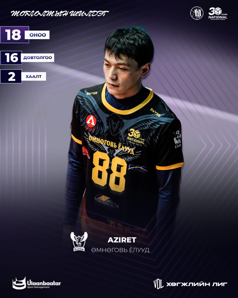 Команда игрока сборной Кыргызстана по волейболу Ильяза Абдымомун уулу (Азирет) одержала очередную победу в чемпионате Монголии.