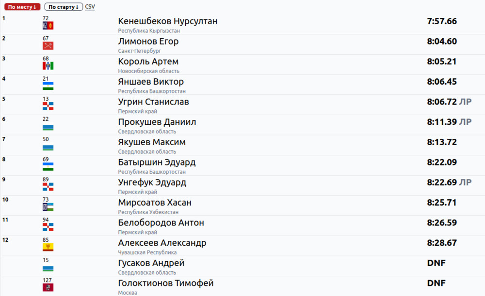 Кыргызстанец финишировал первым с результатом 7 минут 57,66 секунды, обогнав своего преследователя на 7 секунд.