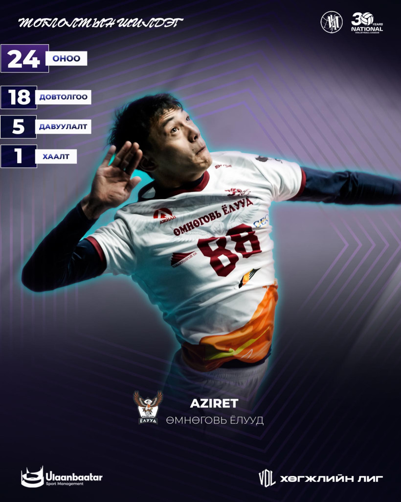 Игрок сборной Кыргызстана по волейболу Ильяз Абдымомун уулу (Азирет) в очередной стал лучшим ироком матче в чемпионате Монголии, сообщает Prosports.kz.
