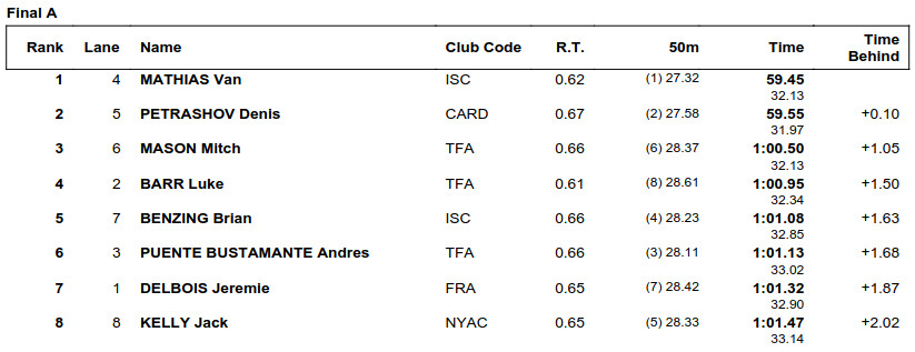 Победителем стал Ван Матиас из США — 59,45 секунды.
