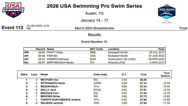 Очередной этап турнира Pro Swim Series проходит в эти дни в городе Остин (штат Техас, США). 16 января стартовали состязания на дистанции 50 метров брассом.