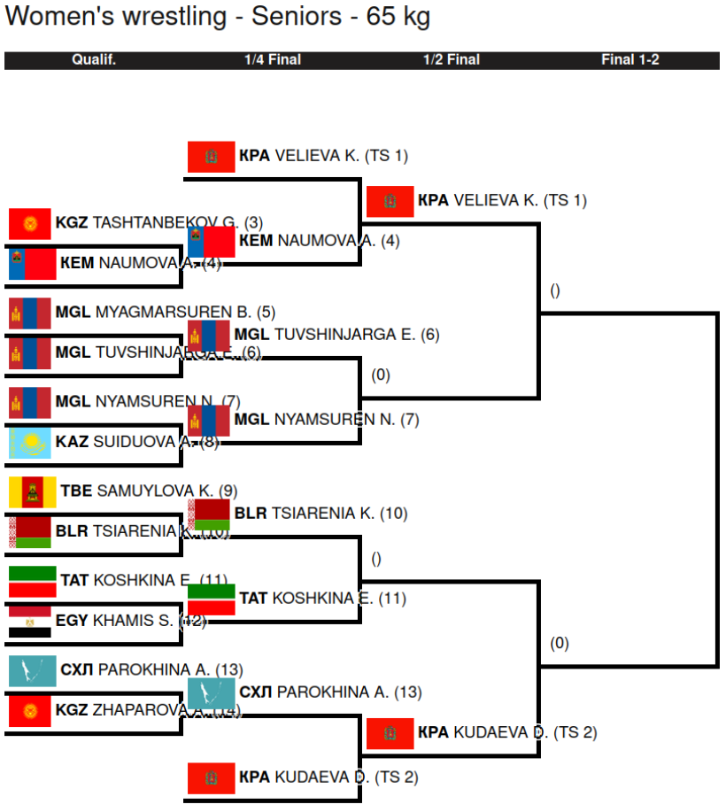 В весовой категории до 65 кг выступали Гульнура Таштанбекова и Асель Жапарова. Обе проиграли в первых схватках соперницам из России, которые в следующем круге также проиграли и лишили кыргызстанок шансов не медали.